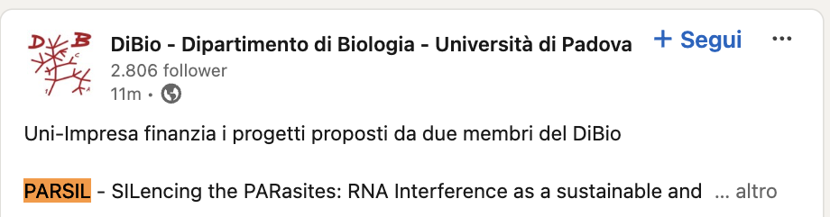 Newpharm è lieta di annunciare la partecipazione al progetto “PARSIL – SILencing the PARasites: RNA Interference as a sustainable and innovative tool for managing Varroa destructor and Dermanyssus gallinae“, coordinato dal Prof. Giuseppe Fusco, in collaborazione con il Dipartimento di Biologia dell’Università degli Studi di Padova e l’azienda Smart Bugs.