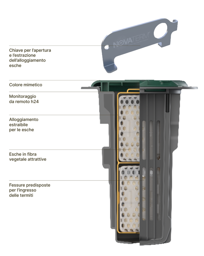 Stazione progettata per l’installazione nel terreno o nel cemento, adatta sia per il monitoraggio termiti, sia per il trattamento preventivo o curativo delle infestazioni. In essa vengono alloggiate le capsule (pag. 101), esche in fibra vegetale attrattive per le termiti. Il sistema è disponibile in due versioni: Novaterm® IGS 868 MHz, dotato di sensore integrato per il monitoraggio remoto tramite Novaterm® Box, e Novaterm® IGS, senza connessione.